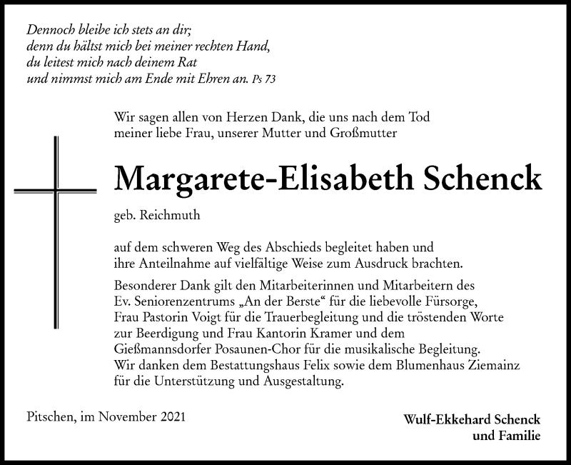 Hier finden Sie alle Traueranzeigen aus der Zeitung, die bisher für Margarete-Elisabeth Schenck erschienen sind. Weitere Traueranzeigen, die in der Zeitung erscheinen, werden hier ebenfalls aufgelistet