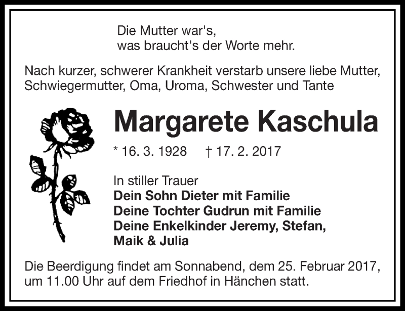 Hier finden Sie alle Traueranzeigen aus der Zeitung, die bisher für Margarete Kaschula erschienen sind. Weitere Traueranzeigen, die in der Zeitung erscheinen, werden hier ebenfalls aufgelistet