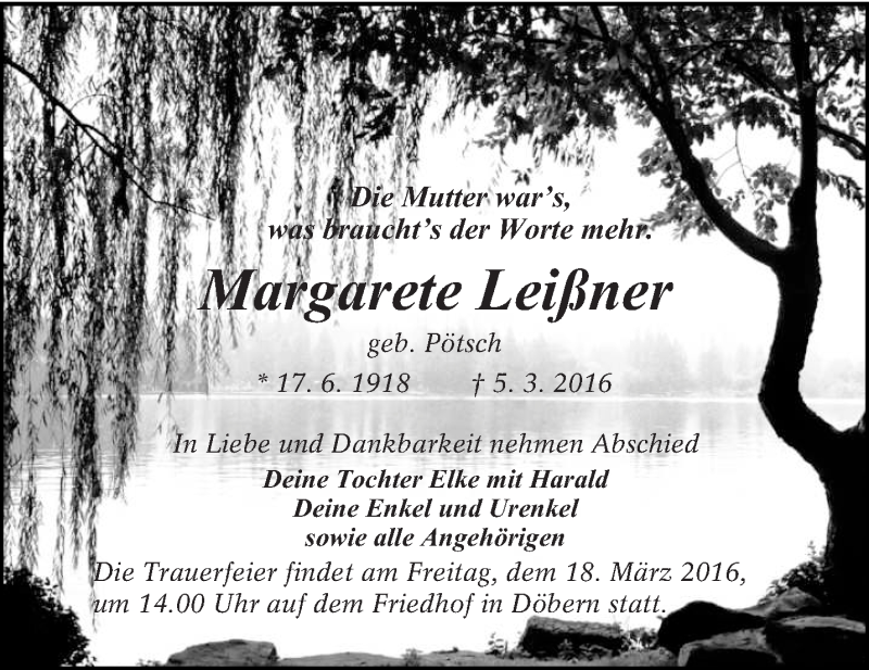 Hier finden Sie alle Traueranzeigen aus der Zeitung, die bisher für Margarete Leißner erschienen sind. Weitere Traueranzeigen, die in der Zeitung erscheinen, werden hier ebenfalls aufgelistet