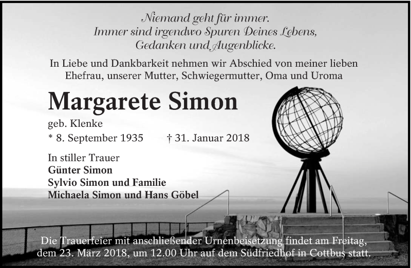 Hier finden Sie alle Traueranzeigen aus der Zeitung, die bisher für Margarete Simon erschienen sind. Weitere Traueranzeigen, die in der Zeitung erscheinen, werden hier ebenfalls aufgelistet