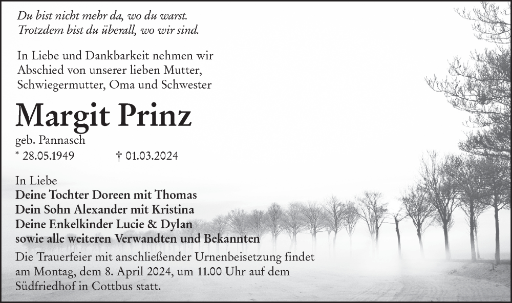 Hier finden Sie alle Traueranzeigen aus der Zeitung, die bisher für Margit Prinz erschienen sind. Weitere Traueranzeigen, die in der Zeitung erscheinen, werden hier ebenfalls aufgelistet