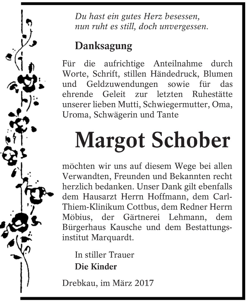 Hier finden Sie alle Traueranzeigen aus der Zeitung, die bisher für Margot Schober erschienen sind. Weitere Traueranzeigen, die in der Zeitung erscheinen, werden hier ebenfalls aufgelistet