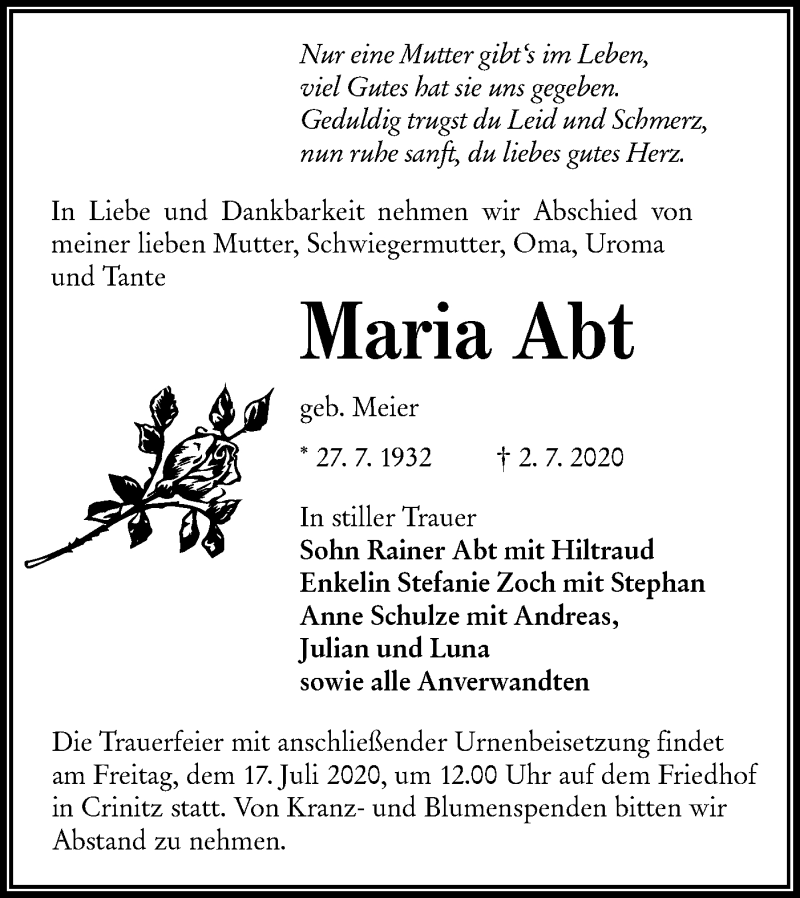 Hier finden Sie alle Traueranzeigen aus der Zeitung, die bisher für Maria Abt erschienen sind. Weitere Traueranzeigen, die in der Zeitung erscheinen, werden hier ebenfalls aufgelistet