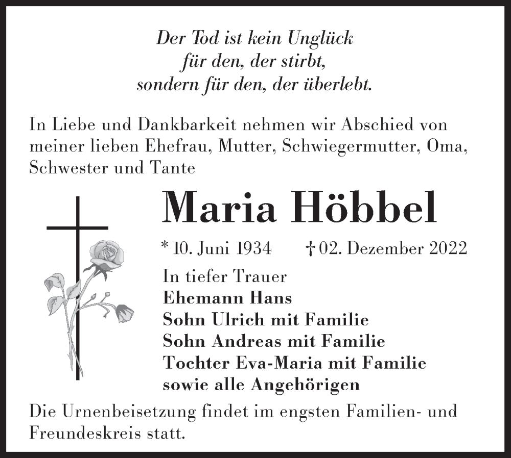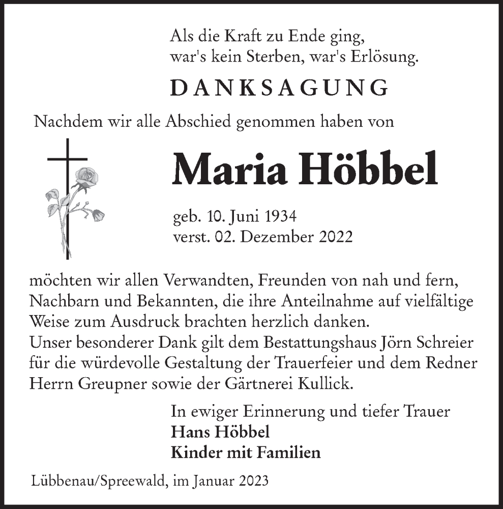 Hier finden Sie alle Traueranzeigen aus der Zeitung, die bisher für Maria Höbbel erschienen sind. Weitere Traueranzeigen, die in der Zeitung erscheinen, werden hier ebenfalls aufgelistet