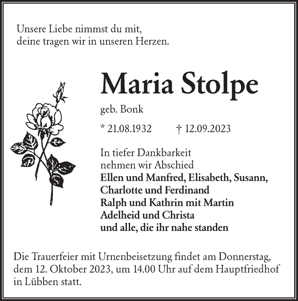 Hier finden Sie alle Traueranzeigen aus der Zeitung, die bisher für Maria Stolpe erschienen sind. Weitere Traueranzeigen, die in der Zeitung erscheinen, werden hier ebenfalls aufgelistet