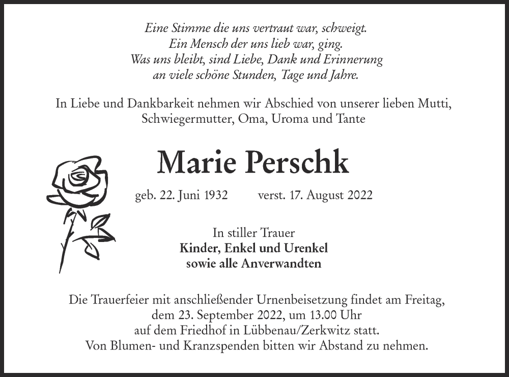 Hier finden Sie alle Traueranzeigen aus der Zeitung, die bisher für Marie Perschk erschienen sind. Weitere Traueranzeigen, die in der Zeitung erscheinen, werden hier ebenfalls aufgelistet