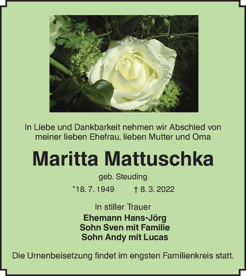 Hier finden Sie alle Traueranzeigen aus der Zeitung, die bisher für Maritta Mattuschka erschienen sind. Weitere Traueranzeigen, die in der Zeitung erscheinen, werden hier ebenfalls aufgelistet