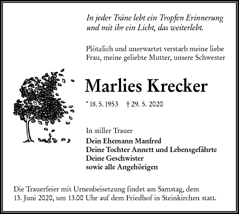 Hier finden Sie alle Traueranzeigen aus der Zeitung, die bisher für Marlies Krecker erschienen sind. Weitere Traueranzeigen, die in der Zeitung erscheinen, werden hier ebenfalls aufgelistet