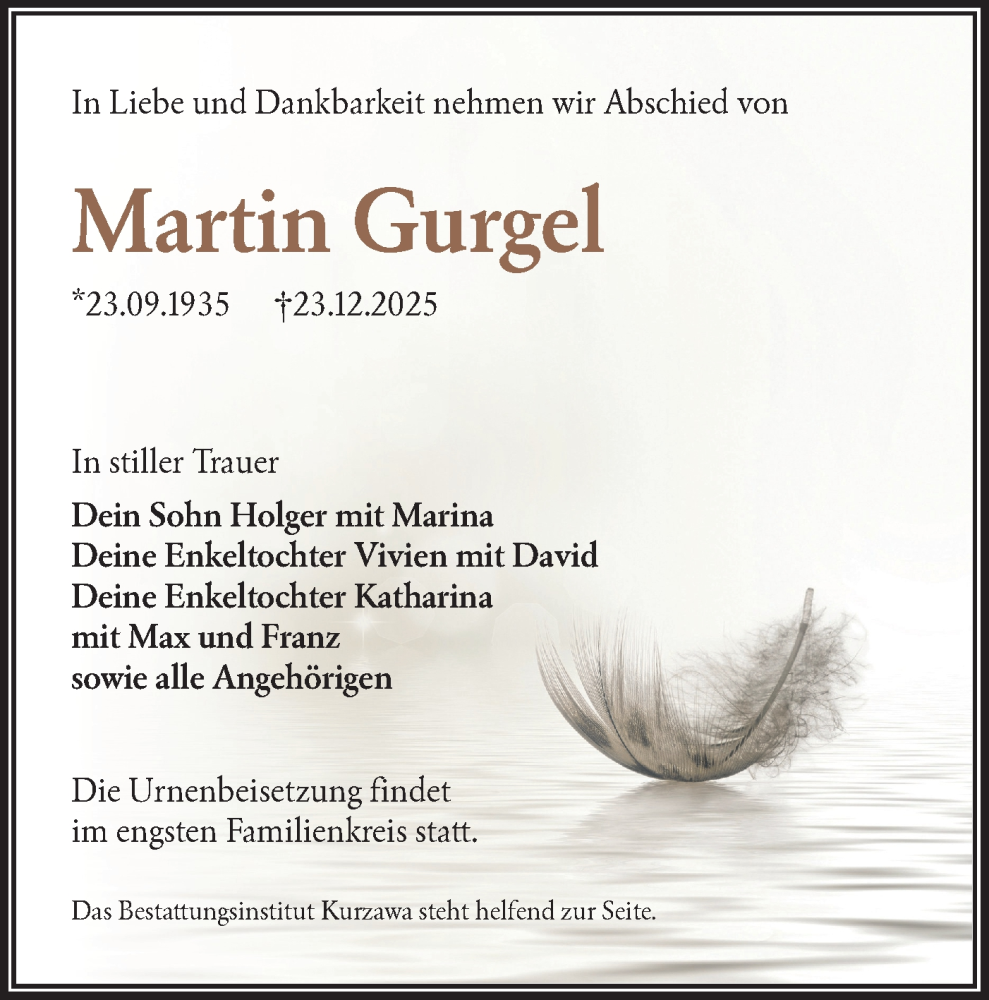Hier finden Sie alle Traueranzeigen aus der Zeitung, die bisher für Martin Gurgel erschienen sind. Weitere Traueranzeigen, die in der Zeitung erscheinen, werden hier ebenfalls aufgelistet