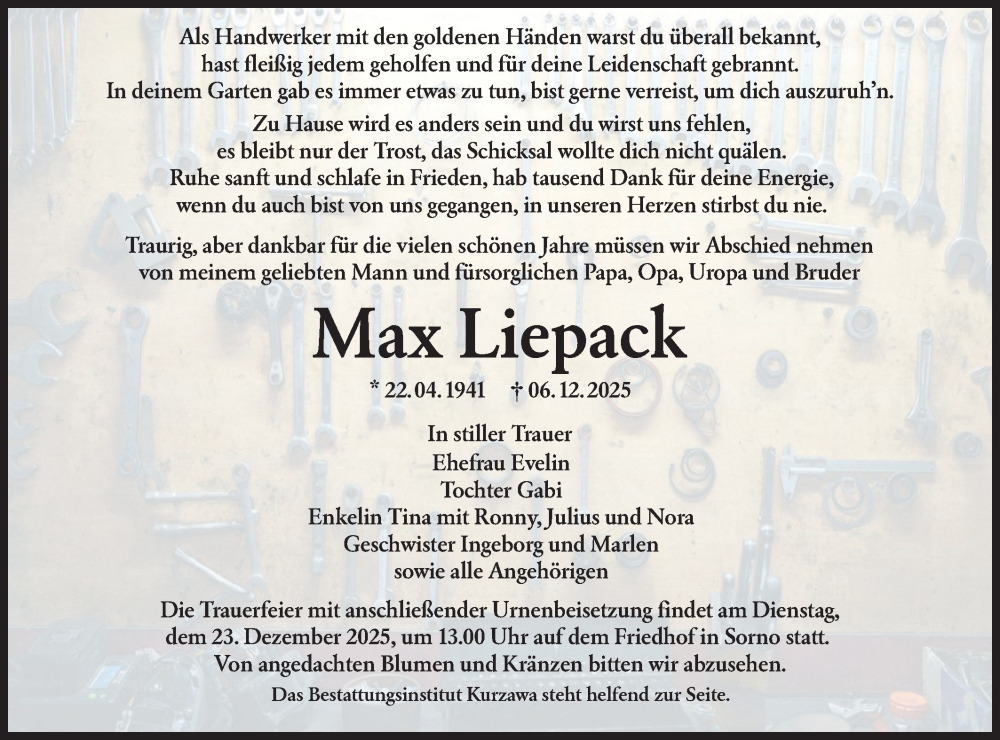 Hier finden Sie alle Traueranzeigen aus der Zeitung, die bisher für Max Liepack erschienen sind. Weitere Traueranzeigen, die in der Zeitung erscheinen, werden hier ebenfalls aufgelistet