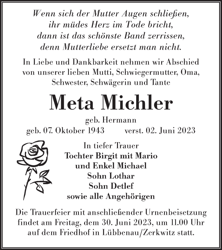 Hier finden Sie alle Traueranzeigen aus der Zeitung, die bisher für Meta Michler erschienen sind. Weitere Traueranzeigen, die in der Zeitung erscheinen, werden hier ebenfalls aufgelistet