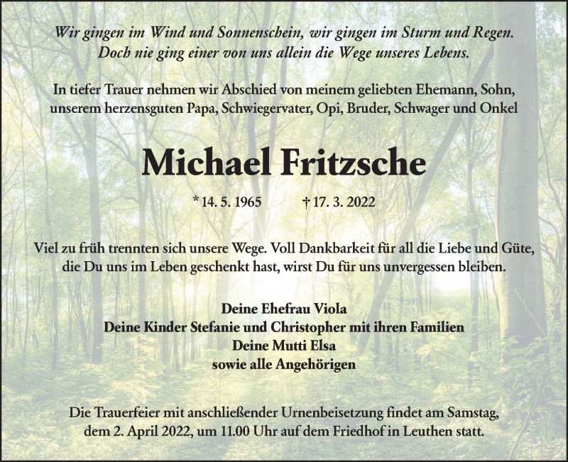 Hier finden Sie alle Traueranzeigen aus der Zeitung, die bisher für Michael Fritzsche erschienen sind. Weitere Traueranzeigen, die in der Zeitung erscheinen, werden hier ebenfalls aufgelistet
