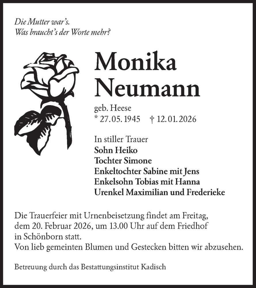 Hier finden Sie alle Traueranzeigen aus der Zeitung, die bisher für Monika Neumann erschienen sind. Weitere Traueranzeigen, die in der Zeitung erscheinen, werden hier ebenfalls aufgelistet