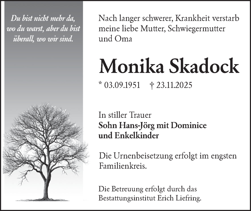Hier finden Sie alle Traueranzeigen aus der Zeitung, die bisher für Monika Skadock erschienen sind. Weitere Traueranzeigen, die in der Zeitung erscheinen, werden hier ebenfalls aufgelistet