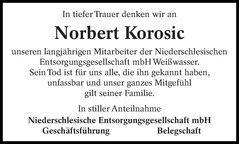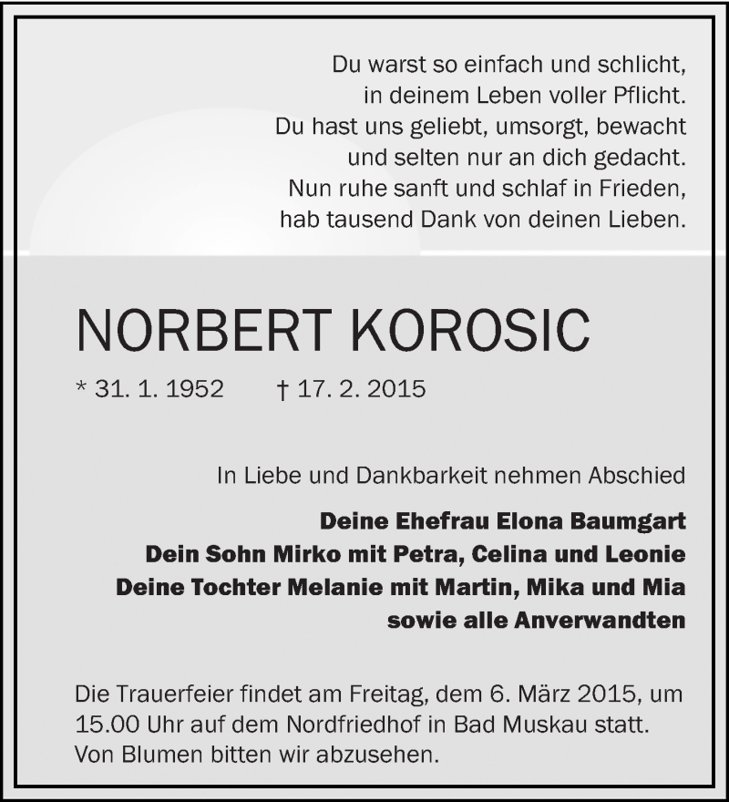 Hier finden Sie alle Traueranzeigen aus der Zeitung, die bisher für Norbert Korosic erschienen sind. Weitere Traueranzeigen, die in der Zeitung erscheinen, werden hier ebenfalls aufgelistet