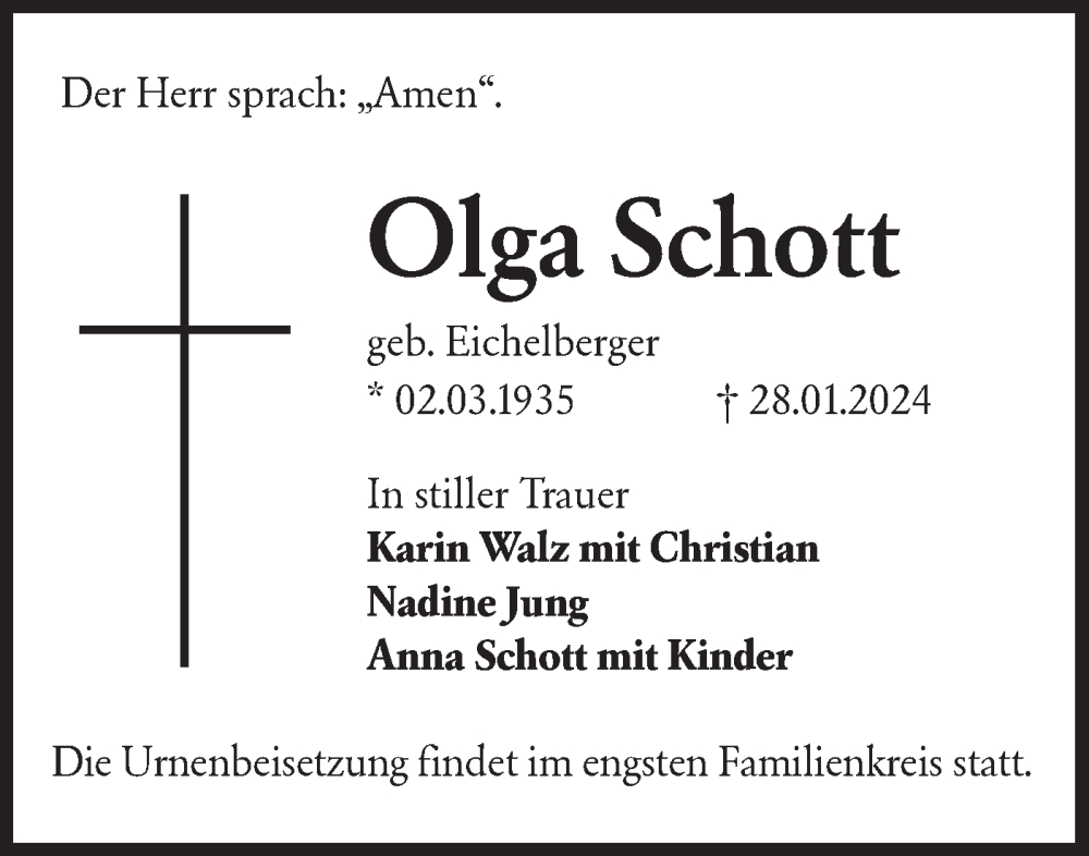 Hier finden Sie alle Traueranzeigen aus der Zeitung, die bisher für Olga Schott erschienen sind. Weitere Traueranzeigen, die in der Zeitung erscheinen, werden hier ebenfalls aufgelistet