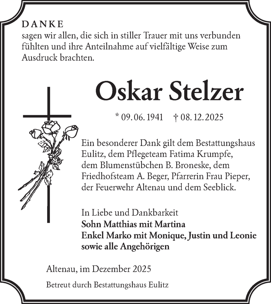 Hier finden Sie alle Traueranzeigen aus der Zeitung, die bisher für Oskar Stelzer erschienen sind. Weitere Traueranzeigen, die in der Zeitung erscheinen, werden hier ebenfalls aufgelistet