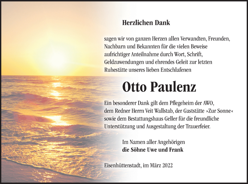 Hier finden Sie alle Traueranzeigen aus der Zeitung, die bisher für Otto Paulenz erschienen sind. Weitere Traueranzeigen, die in der Zeitung erscheinen, werden hier ebenfalls aufgelistet