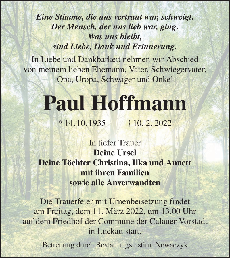 Hier finden Sie alle Traueranzeigen aus der Zeitung, die bisher für Paul Hoffmann erschienen sind. Weitere Traueranzeigen, die in der Zeitung erscheinen, werden hier ebenfalls aufgelistet