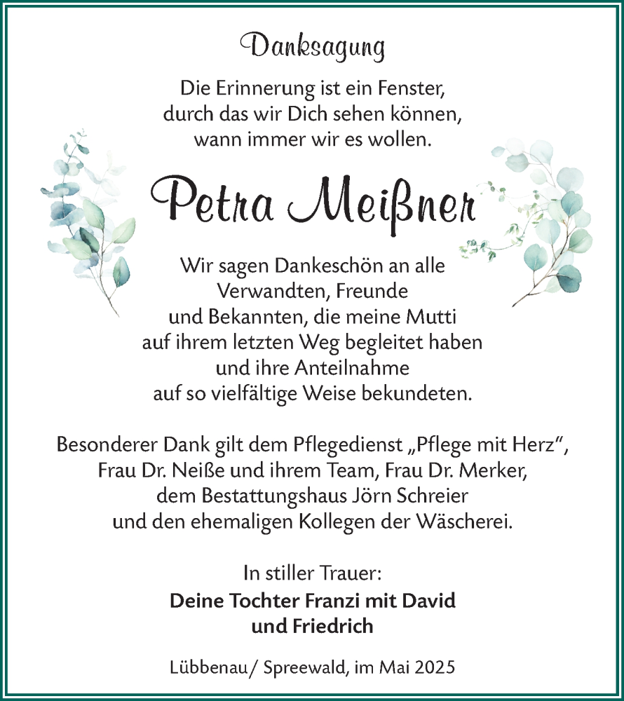 Hier finden Sie alle Traueranzeigen aus der Zeitung, die bisher für Petra Meißner erschienen sind. Weitere Traueranzeigen, die in der Zeitung erscheinen, werden hier ebenfalls aufgelistet