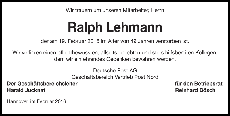 Hier finden Sie alle Traueranzeigen aus der Zeitung, die bisher für Ralph Lehmann erschienen sind. Weitere Traueranzeigen, die in der Zeitung erscheinen, werden hier ebenfalls aufgelistet