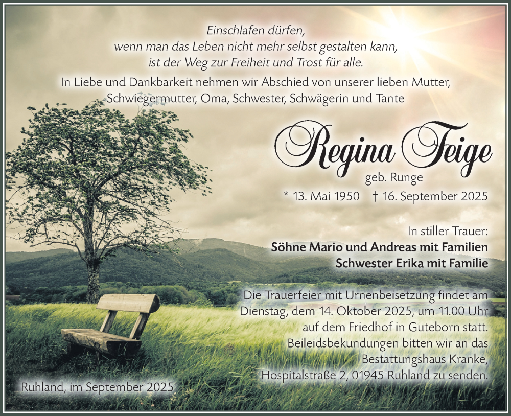 Hier finden Sie alle Traueranzeigen aus der Zeitung, die bisher für Regina Feige erschienen sind. Weitere Traueranzeigen, die in der Zeitung erscheinen, werden hier ebenfalls aufgelistet