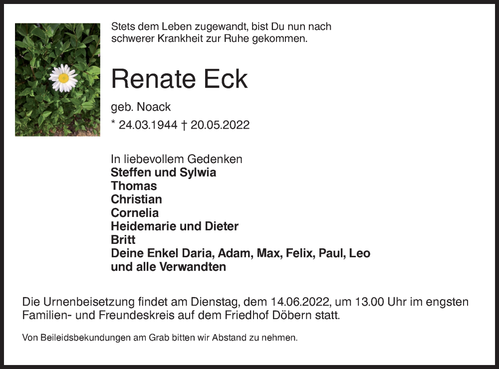 Hier finden Sie alle Traueranzeigen aus der Zeitung, die bisher für Renate Eck erschienen sind. Weitere Traueranzeigen, die in der Zeitung erscheinen, werden hier ebenfalls aufgelistet
