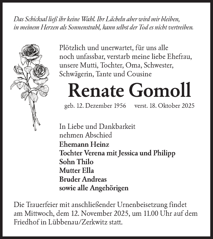 Hier finden Sie alle Traueranzeigen aus der Zeitung, die bisher für Renate Gomoll erschienen sind. Weitere Traueranzeigen, die in der Zeitung erscheinen, werden hier ebenfalls aufgelistet