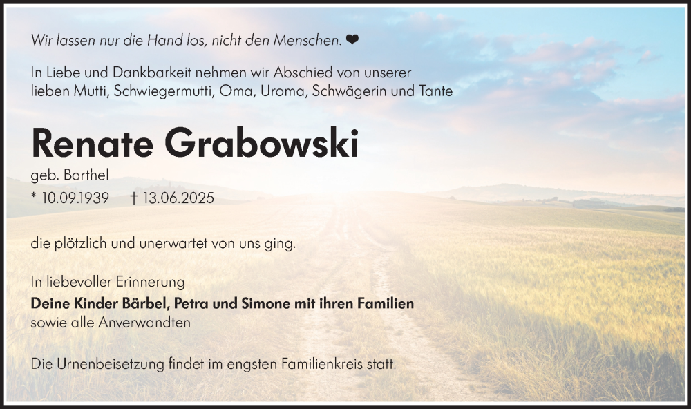 Hier finden Sie alle Traueranzeigen aus der Zeitung, die bisher für Renate Grabowski erschienen sind. Weitere Traueranzeigen, die in der Zeitung erscheinen, werden hier ebenfalls aufgelistet