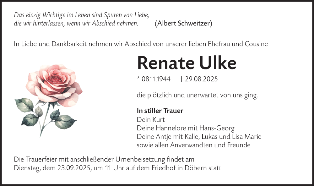 Hier finden Sie alle Traueranzeigen aus der Zeitung, die bisher für Renate Ulke erschienen sind. Weitere Traueranzeigen, die in der Zeitung erscheinen, werden hier ebenfalls aufgelistet
