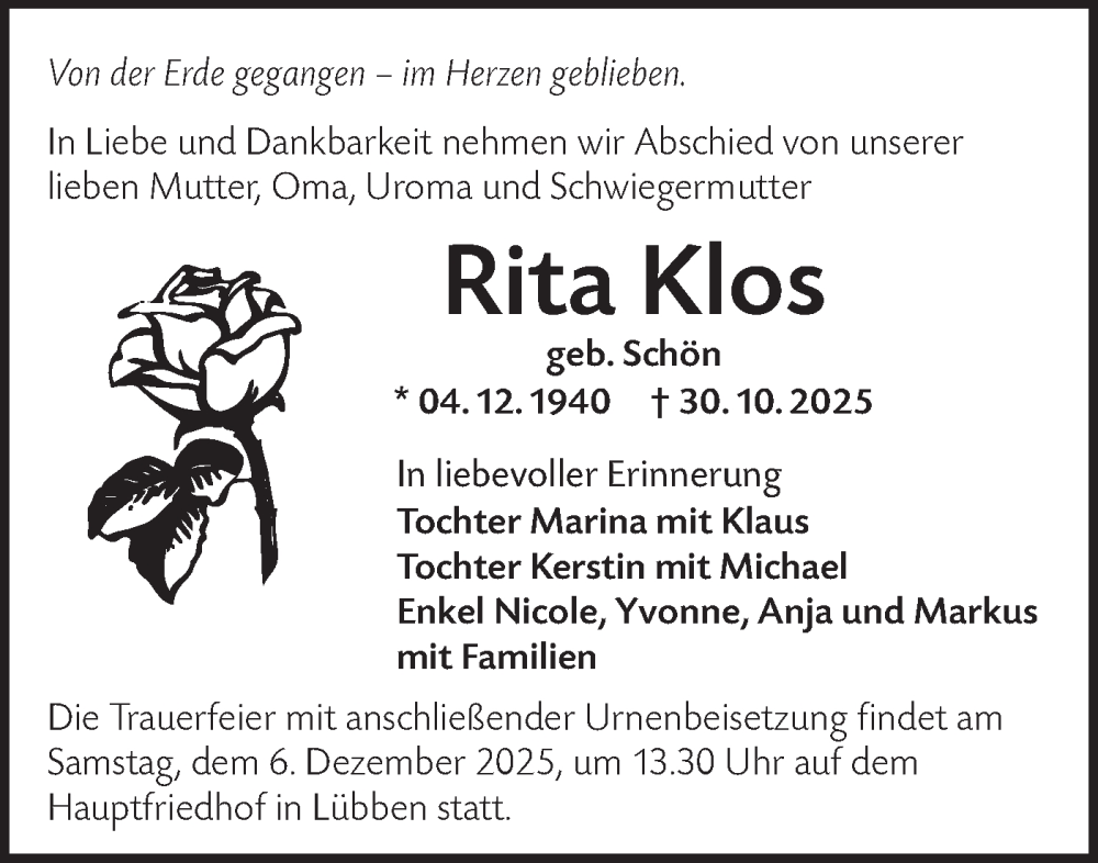 Hier finden Sie alle Traueranzeigen aus der Zeitung, die bisher für Rita Klos erschienen sind. Weitere Traueranzeigen, die in der Zeitung erscheinen, werden hier ebenfalls aufgelistet