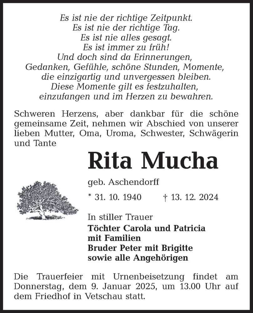 Hier finden Sie alle Traueranzeigen aus der Zeitung, die bisher für Rita Mucha erschienen sind. Weitere Traueranzeigen, die in der Zeitung erscheinen, werden hier ebenfalls aufgelistet