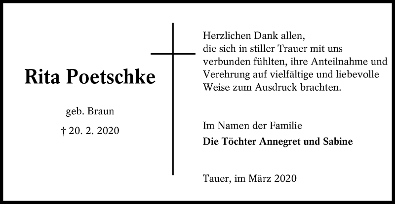 Hier finden Sie alle Traueranzeigen aus der Zeitung, die bisher für Rita Poetschke erschienen sind. Weitere Traueranzeigen, die in der Zeitung erscheinen, werden hier ebenfalls aufgelistet