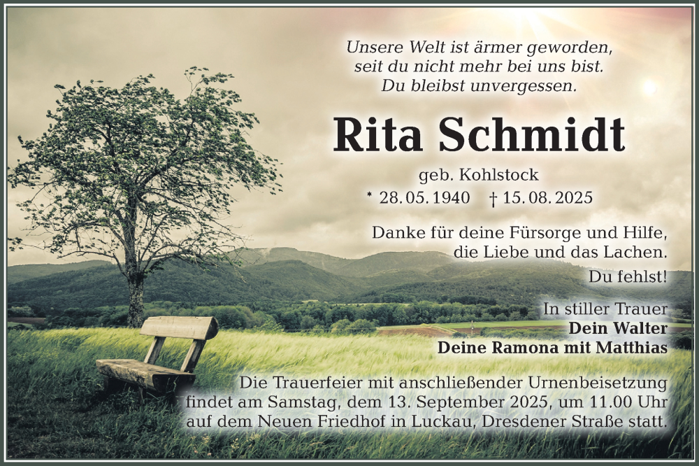 Hier finden Sie alle Traueranzeigen aus der Zeitung, die bisher für Rita Schmidt erschienen sind. Weitere Traueranzeigen, die in der Zeitung erscheinen, werden hier ebenfalls aufgelistet