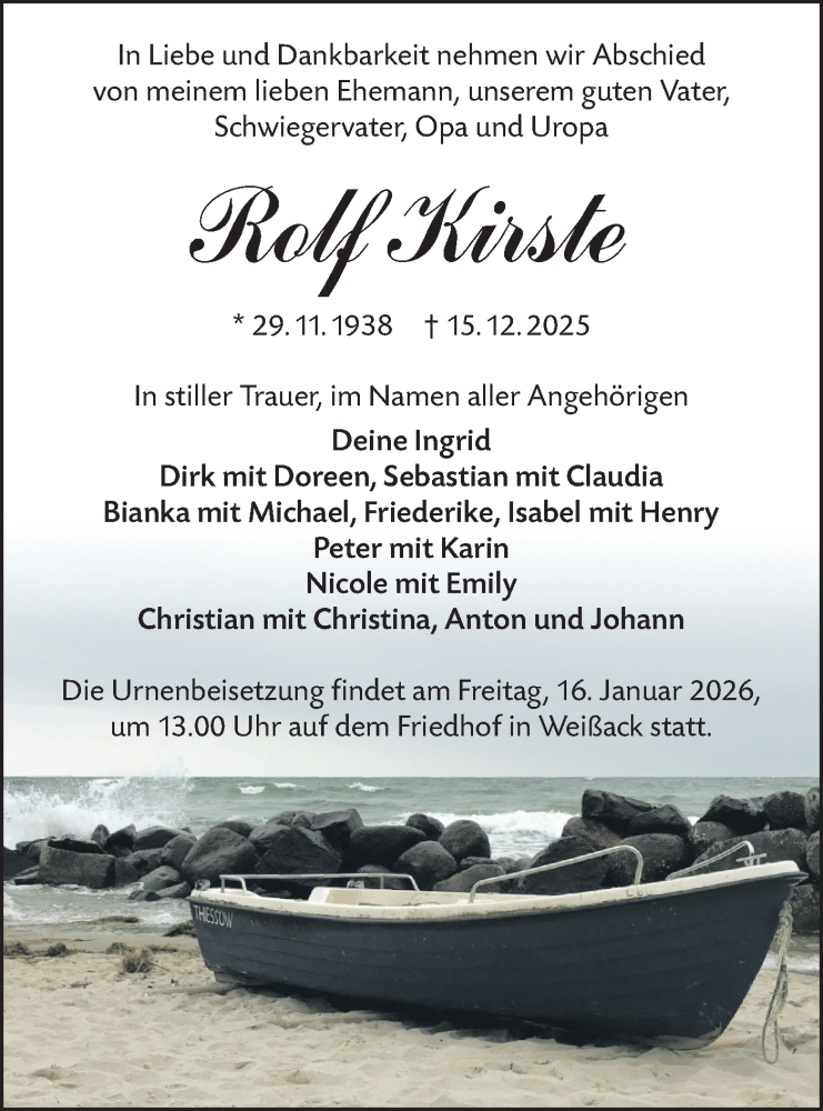 Hier finden Sie alle Traueranzeigen aus der Zeitung, die bisher für Rolf Kirste erschienen sind. Weitere Traueranzeigen, die in der Zeitung erscheinen, werden hier ebenfalls aufgelistet