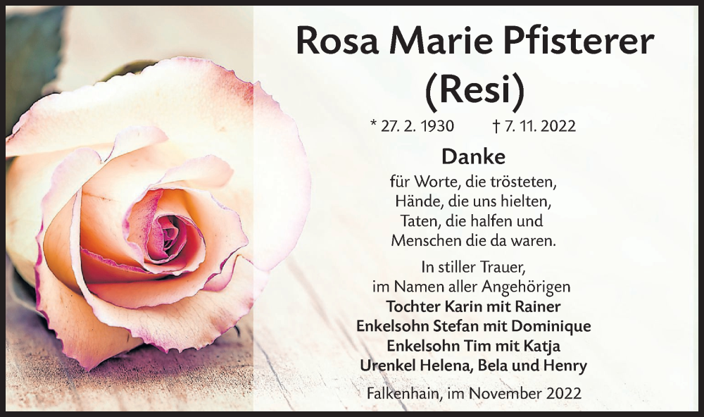 Hier finden Sie alle Traueranzeigen aus der Zeitung, die bisher für Rosa Marie Pfisterer erschienen sind. Weitere Traueranzeigen, die in der Zeitung erscheinen, werden hier ebenfalls aufgelistet