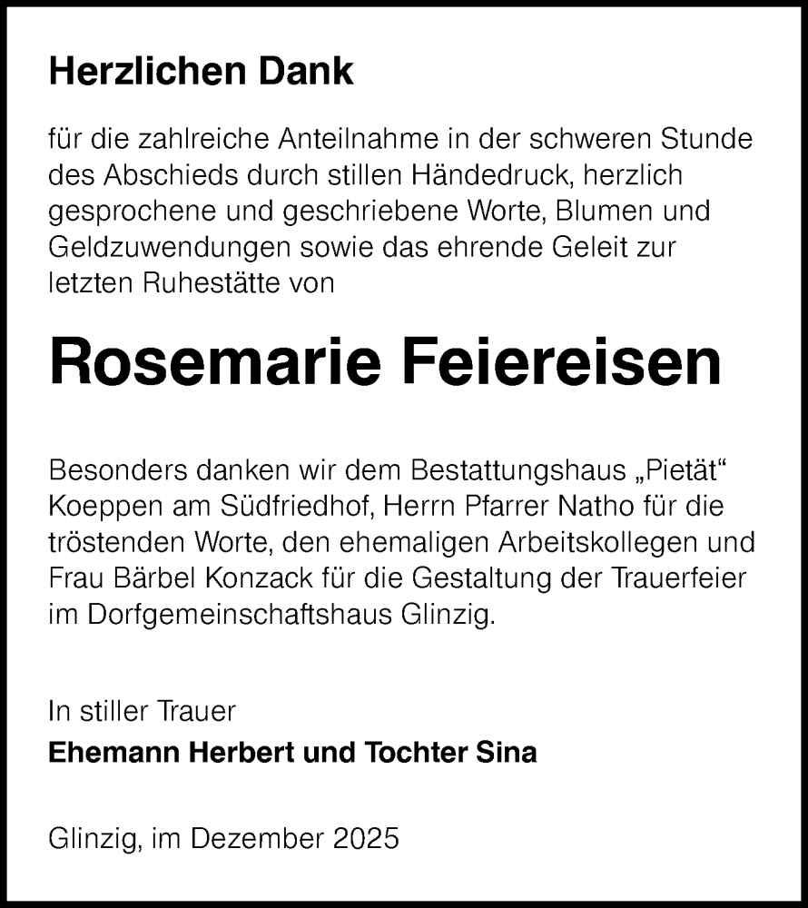 Hier finden Sie alle Traueranzeigen aus der Zeitung, die bisher für Rosemarie Feiereisen erschienen sind. Weitere Traueranzeigen, die in der Zeitung erscheinen, werden hier ebenfalls aufgelistet