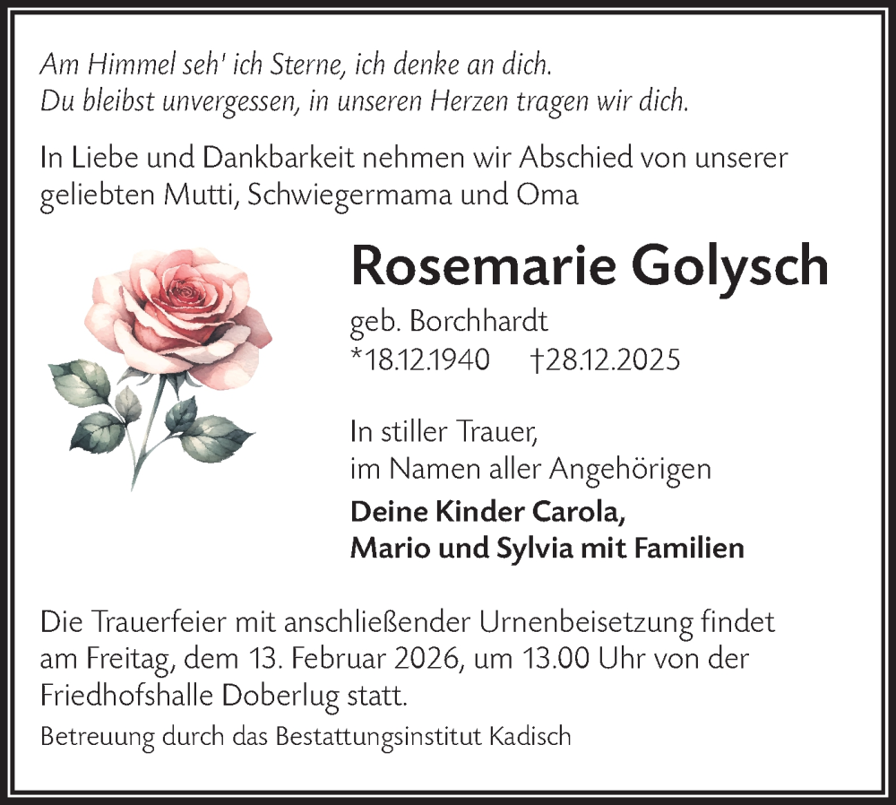 Hier finden Sie alle Traueranzeigen aus der Zeitung, die bisher für Rosemarie Golysch erschienen sind. Weitere Traueranzeigen, die in der Zeitung erscheinen, werden hier ebenfalls aufgelistet