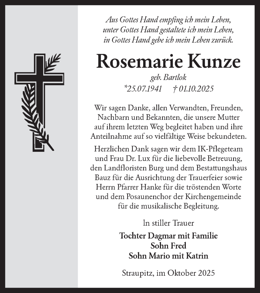 Hier finden Sie alle Traueranzeigen aus der Zeitung, die bisher für Rosemarie Kunze erschienen sind. Weitere Traueranzeigen, die in der Zeitung erscheinen, werden hier ebenfalls aufgelistet