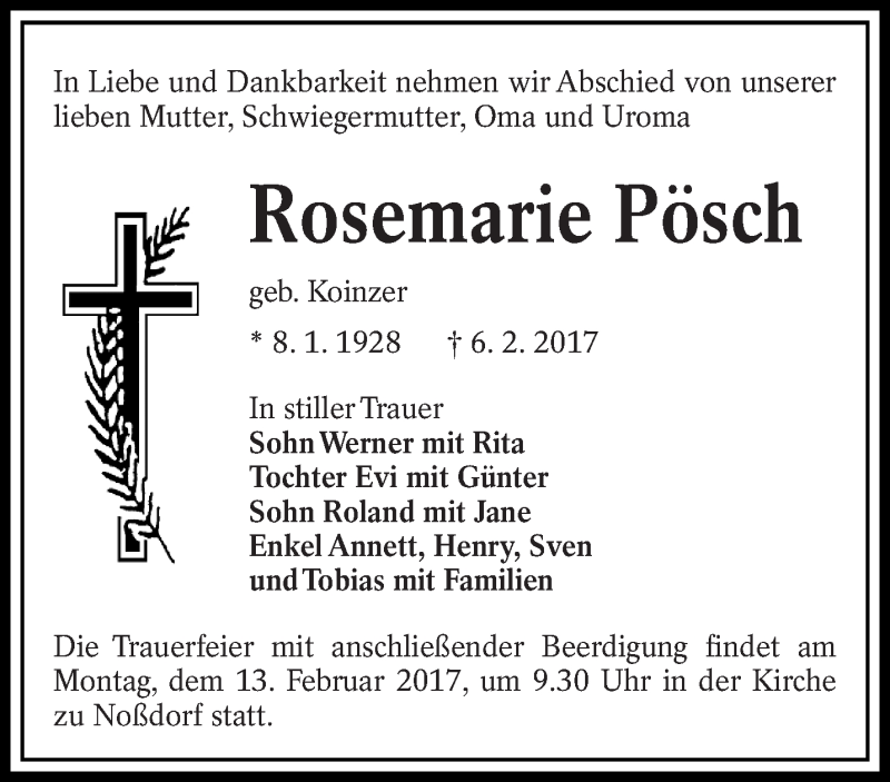 Hier finden Sie alle Traueranzeigen aus der Zeitung, die bisher für Rosemarie Pösch erschienen sind. Weitere Traueranzeigen, die in der Zeitung erscheinen, werden hier ebenfalls aufgelistet