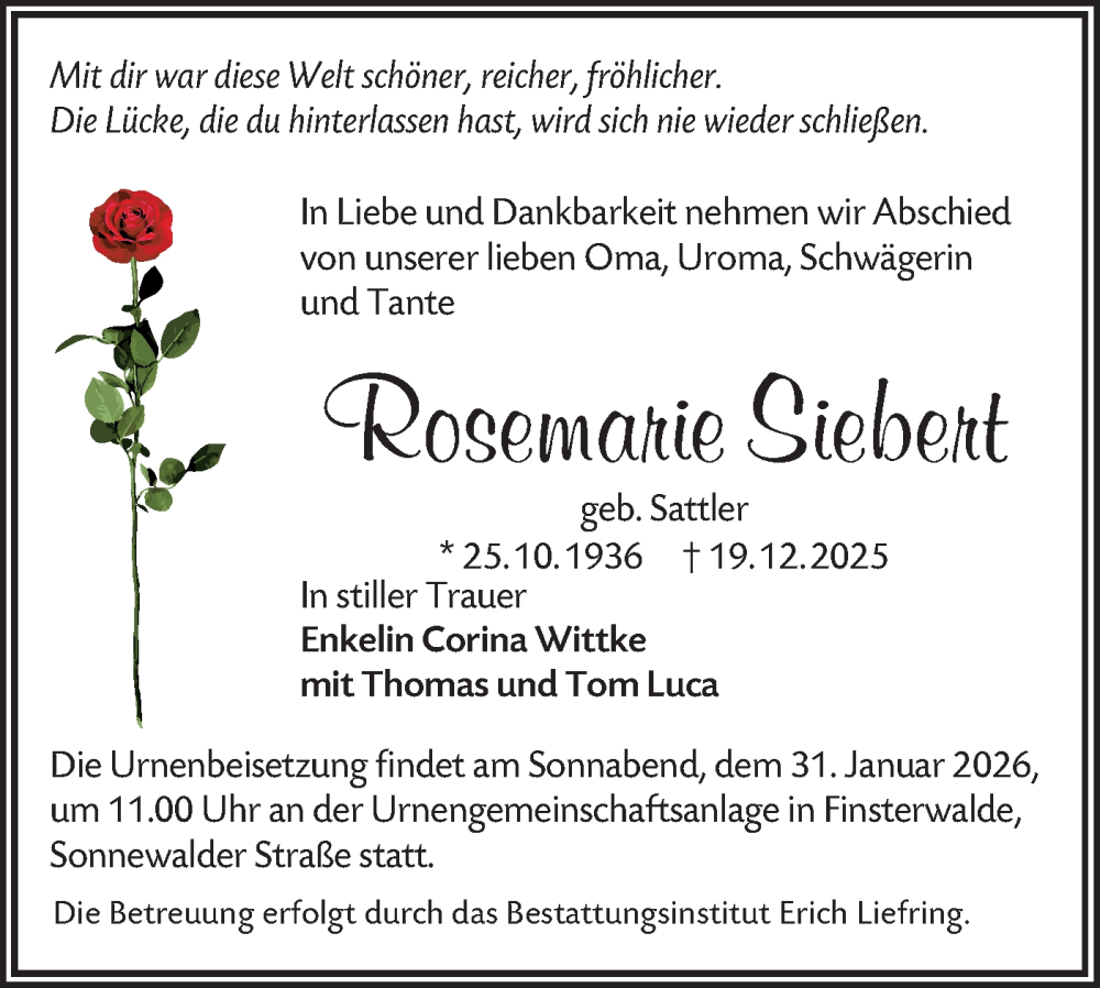 Hier finden Sie alle Traueranzeigen aus der Zeitung, die bisher für Rosemarie Siebert erschienen sind. Weitere Traueranzeigen, die in der Zeitung erscheinen, werden hier ebenfalls aufgelistet