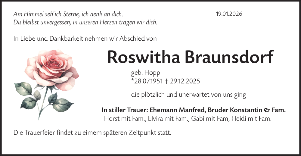 Hier finden Sie alle Traueranzeigen aus der Zeitung, die bisher für Roswitha Braunsdorf erschienen sind. Weitere Traueranzeigen, die in der Zeitung erscheinen, werden hier ebenfalls aufgelistet