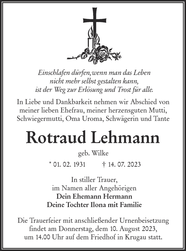 Hier finden Sie alle Traueranzeigen aus der Zeitung, die bisher für Rotraud Lehmann erschienen sind. Weitere Traueranzeigen, die in der Zeitung erscheinen, werden hier ebenfalls aufgelistet