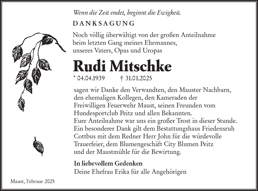 Hier finden Sie alle Traueranzeigen aus der Zeitung, die bisher für Rudi Mitschke erschienen sind. Weitere Traueranzeigen, die in der Zeitung erscheinen, werden hier ebenfalls aufgelistet