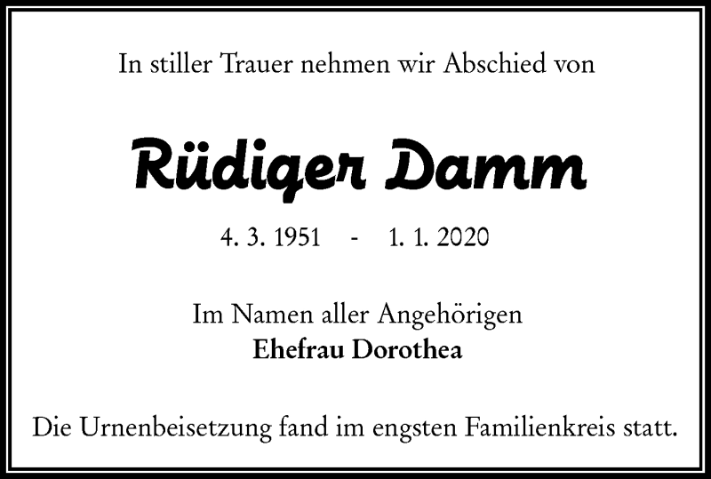 Hier finden Sie alle Traueranzeigen aus der Zeitung, die bisher für Rüdiger Damm erschienen sind. Weitere Traueranzeigen, die in der Zeitung erscheinen, werden hier ebenfalls aufgelistet