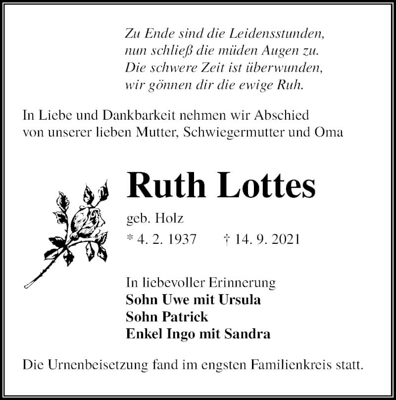Hier finden Sie alle Traueranzeigen aus der Zeitung, die bisher für Ruth Lottes erschienen sind. Weitere Traueranzeigen, die in der Zeitung erscheinen, werden hier ebenfalls aufgelistet