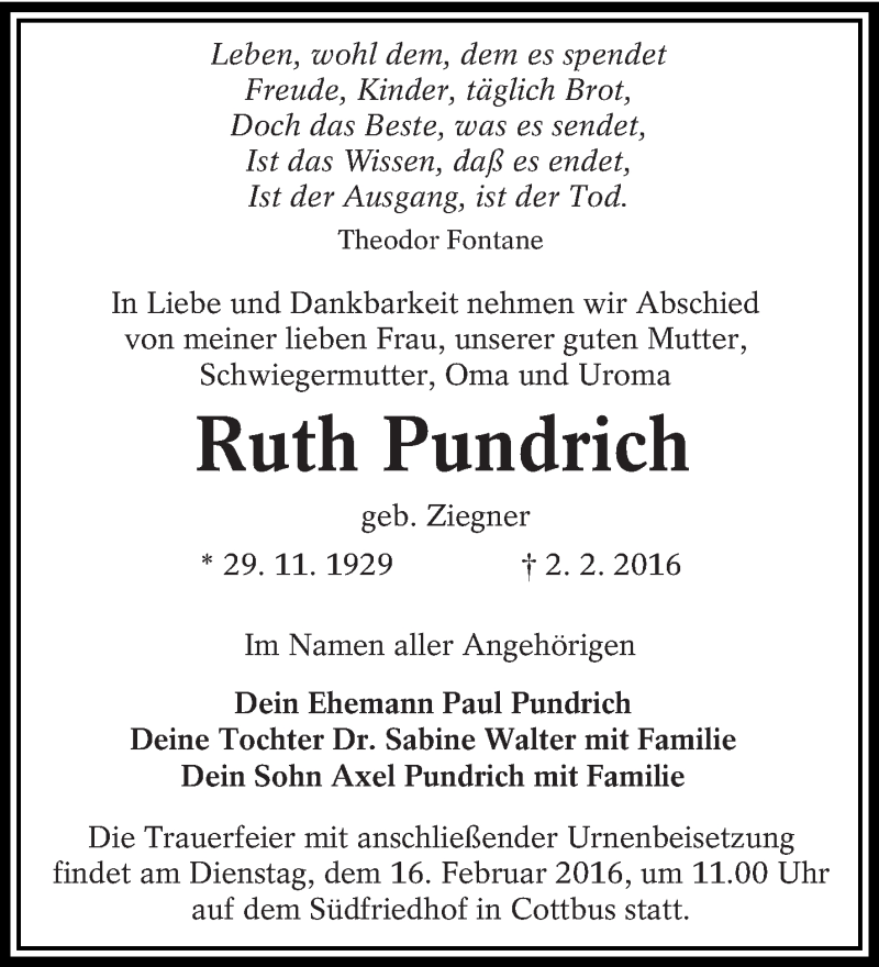 Hier finden Sie alle Traueranzeigen aus der Zeitung, die bisher für Ruth Pundrich erschienen sind. Weitere Traueranzeigen, die in der Zeitung erscheinen, werden hier ebenfalls aufgelistet