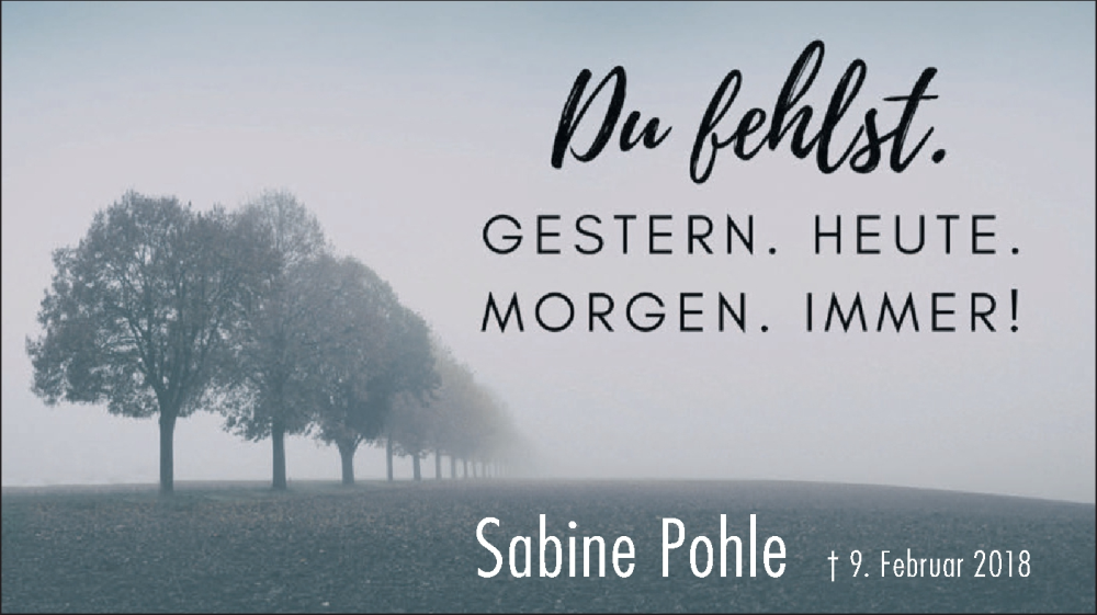Hier finden Sie alle Traueranzeigen aus der Zeitung, die bisher für Sabine Pohle erschienen sind. Weitere Traueranzeigen, die in der Zeitung erscheinen, werden hier ebenfalls aufgelistet
