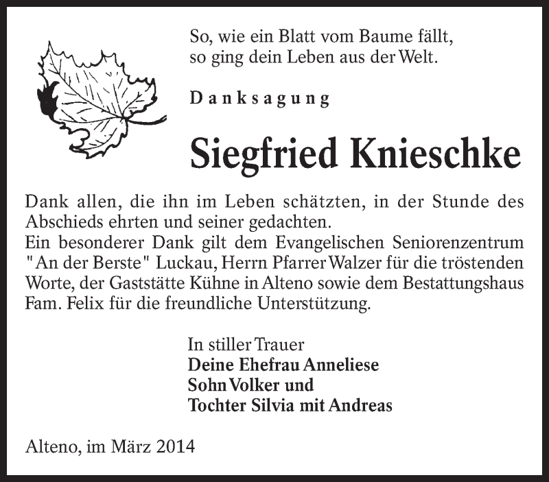 Hier finden Sie alle Traueranzeigen aus der Zeitung, die bisher für Siegfried Knieschke erschienen sind. Weitere Traueranzeigen, die in der Zeitung erscheinen, werden hier ebenfalls aufgelistet