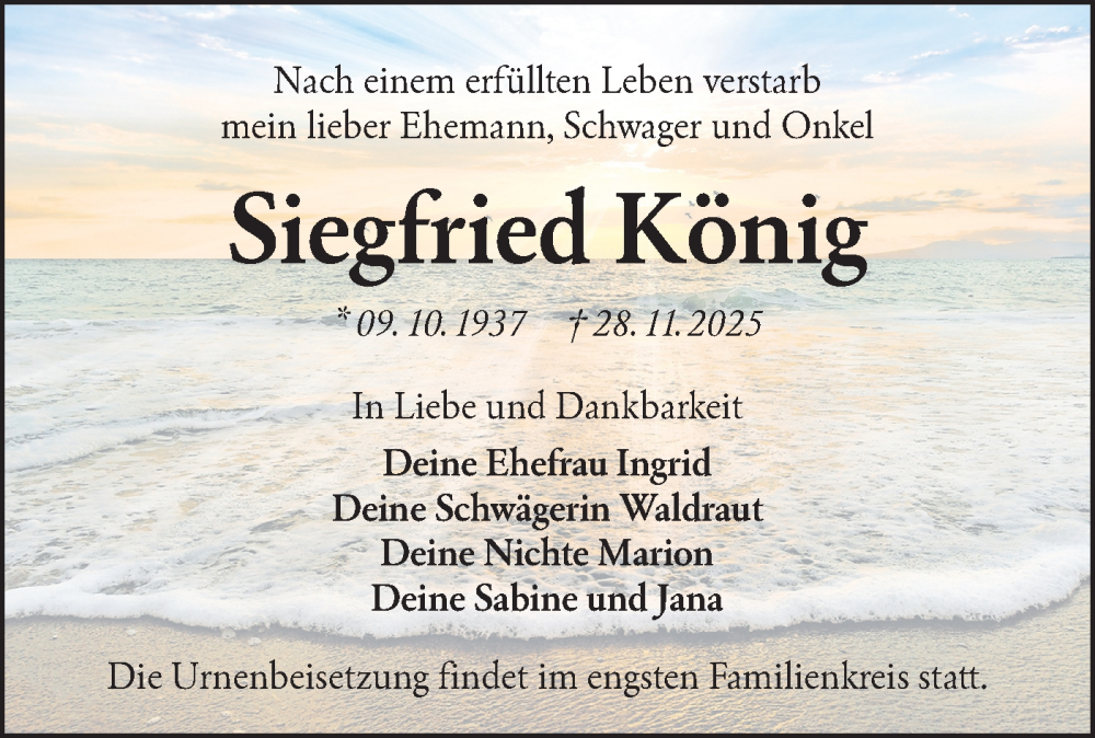 Hier finden Sie alle Traueranzeigen aus der Zeitung, die bisher für Siegfried König erschienen sind. Weitere Traueranzeigen, die in der Zeitung erscheinen, werden hier ebenfalls aufgelistet